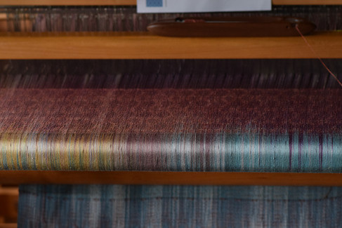Die nächste Seidenkette mit Schweizer Seide ist angewebt. Spitzkoppe ist ein Tuch mit Farbverlauf Rostrot/Gold/Türkis und "wir zwei beide" ist in harmonischen Violette/Aubergine/Grün Farben gefärbt.